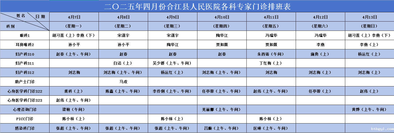 必威betway西汉姆联官方网站2025.04.07-2025.04.13各科专家门诊排班表