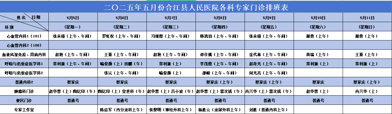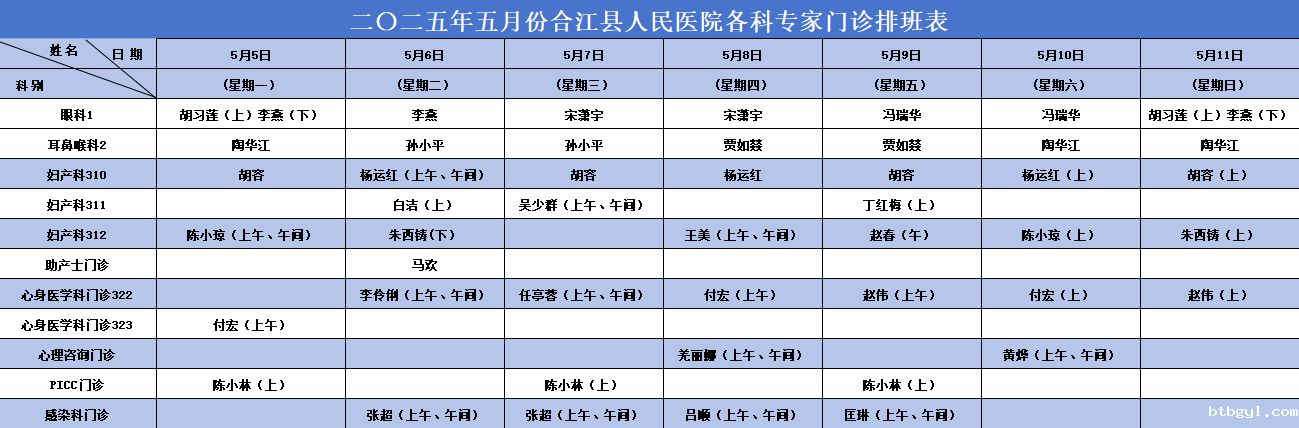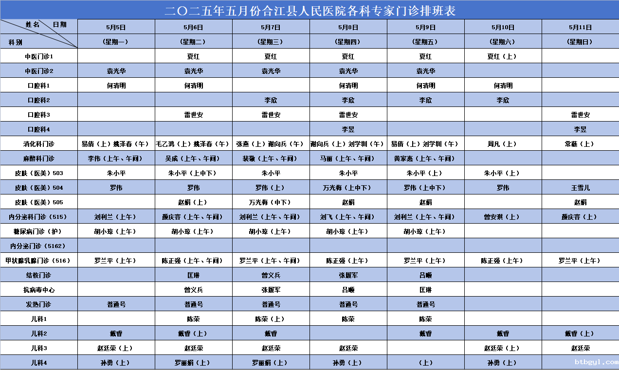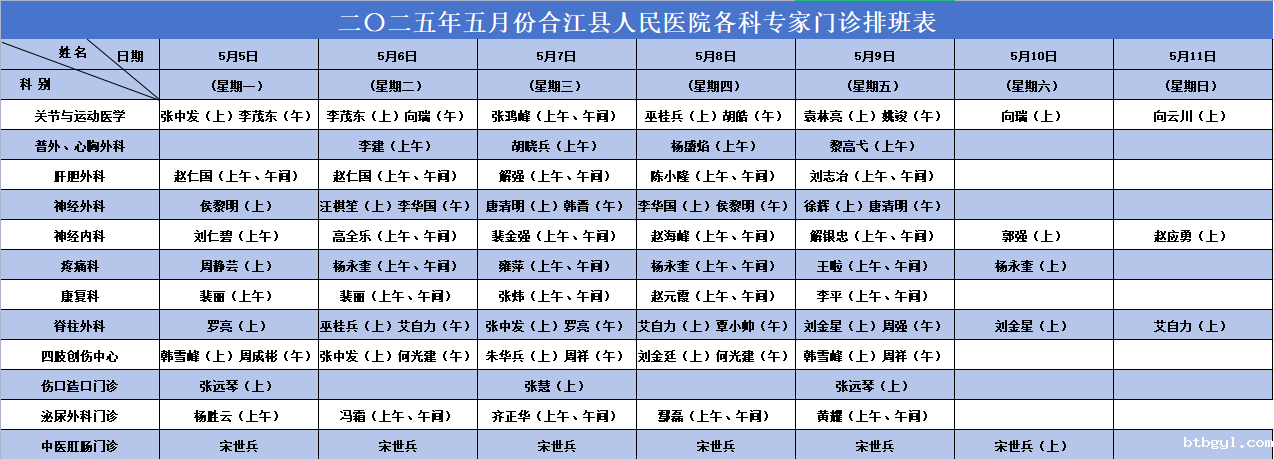 必威betway西汉姆联官方网站2025.05.05-2025.05.11各科专家门诊排班表