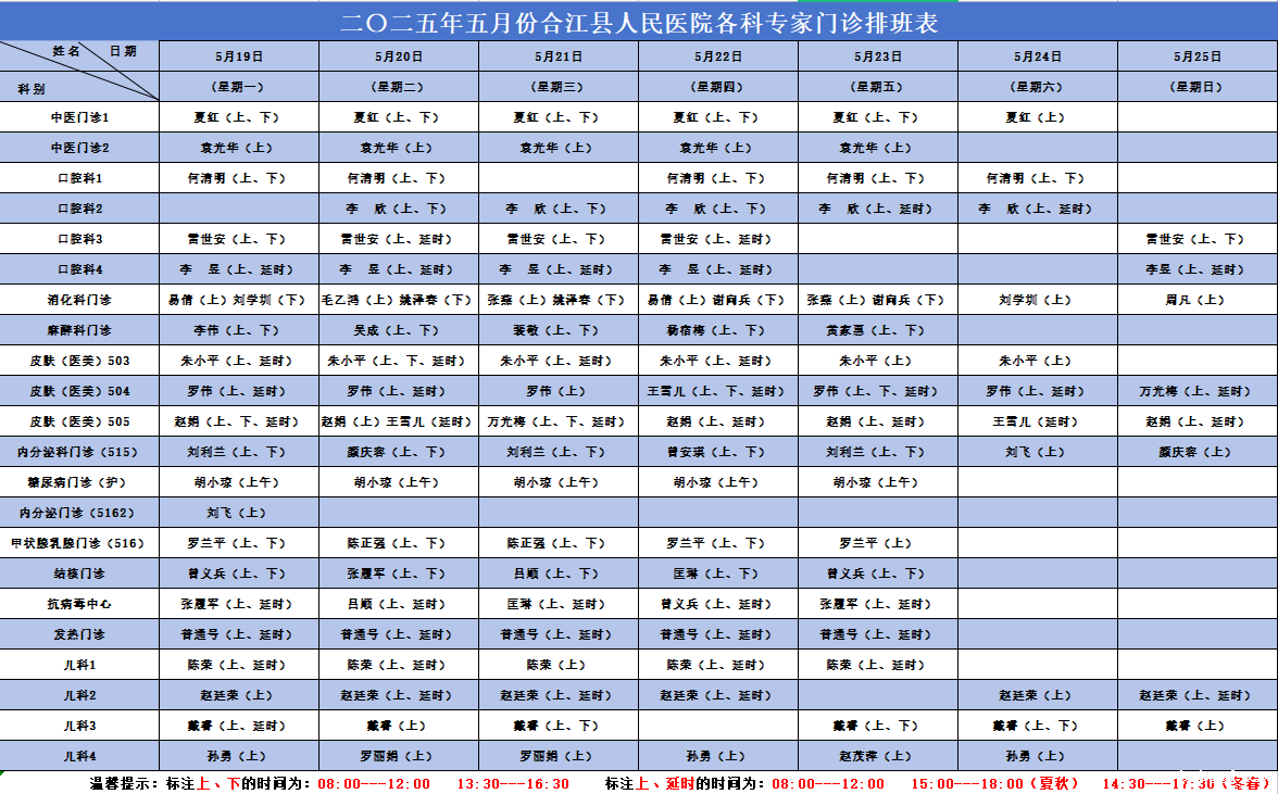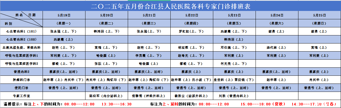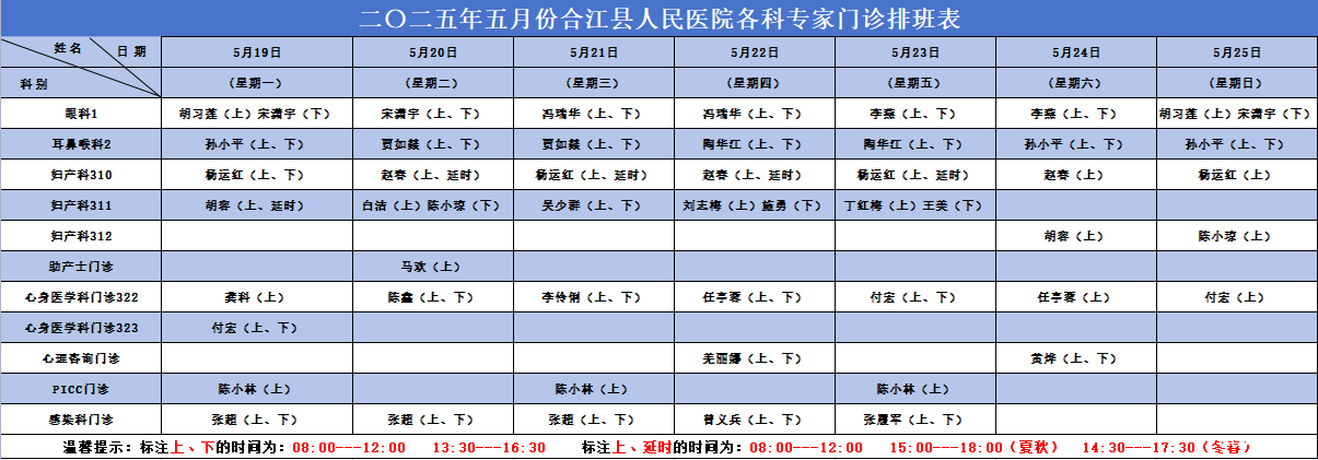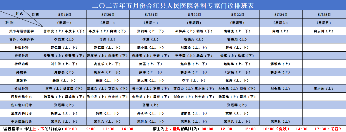 必威betway西汉姆联官方网站2025.05.19-2025.05.25各科专家门诊排班表