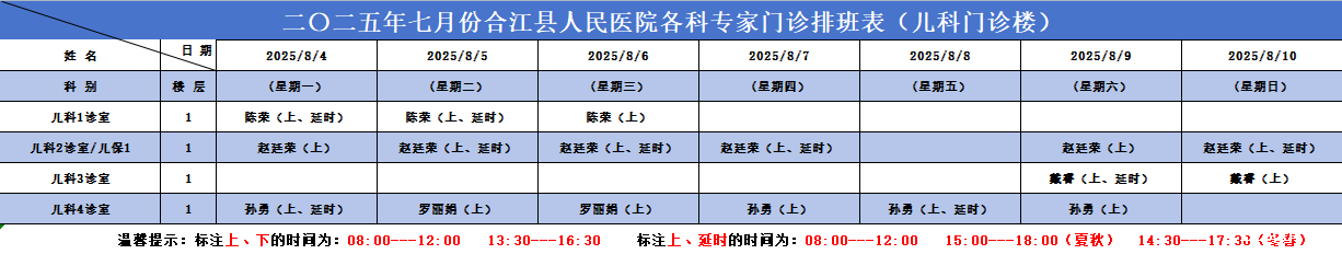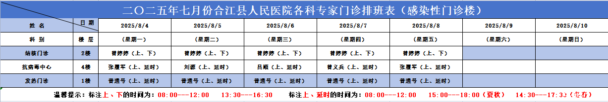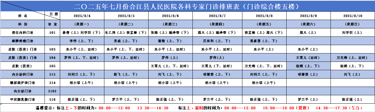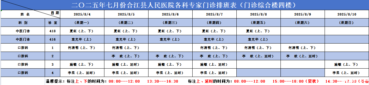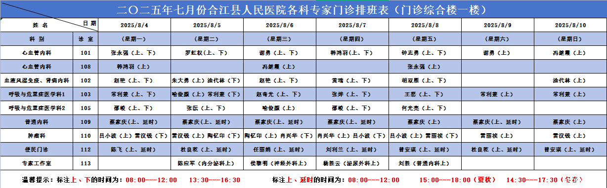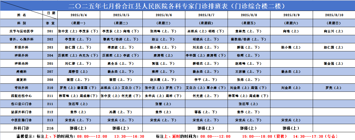 必威betway西汉姆联官方网站2025.08.04-2025.08.10各科专家门诊排班表