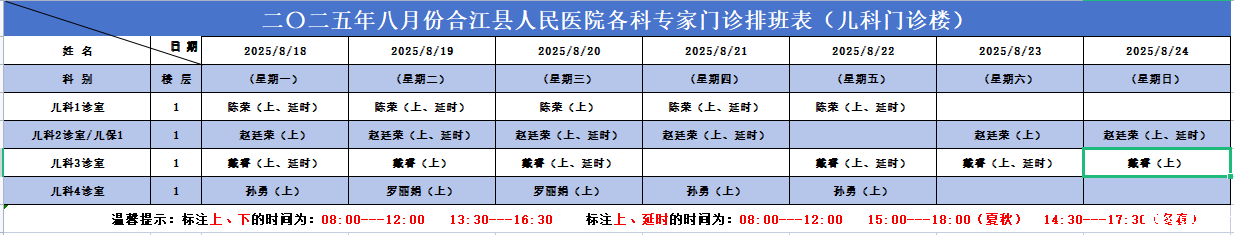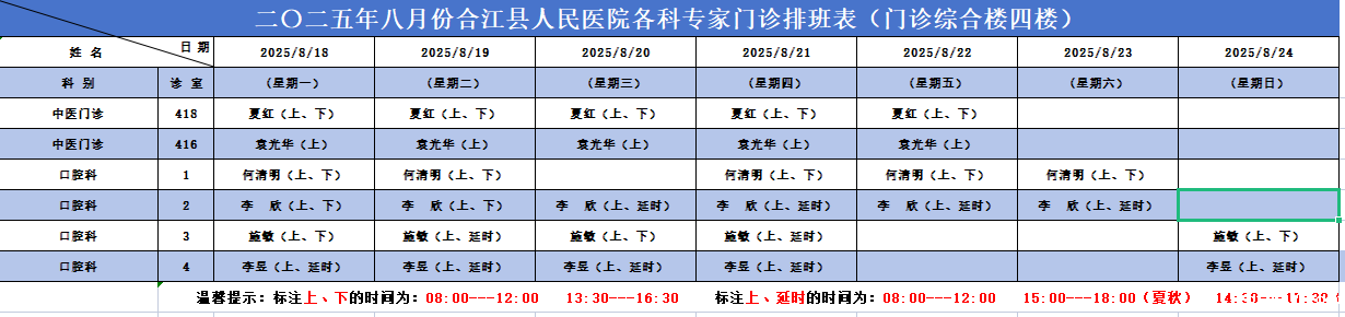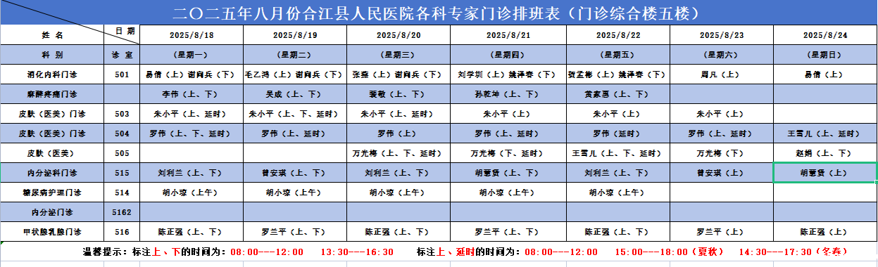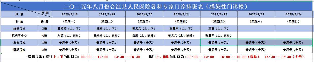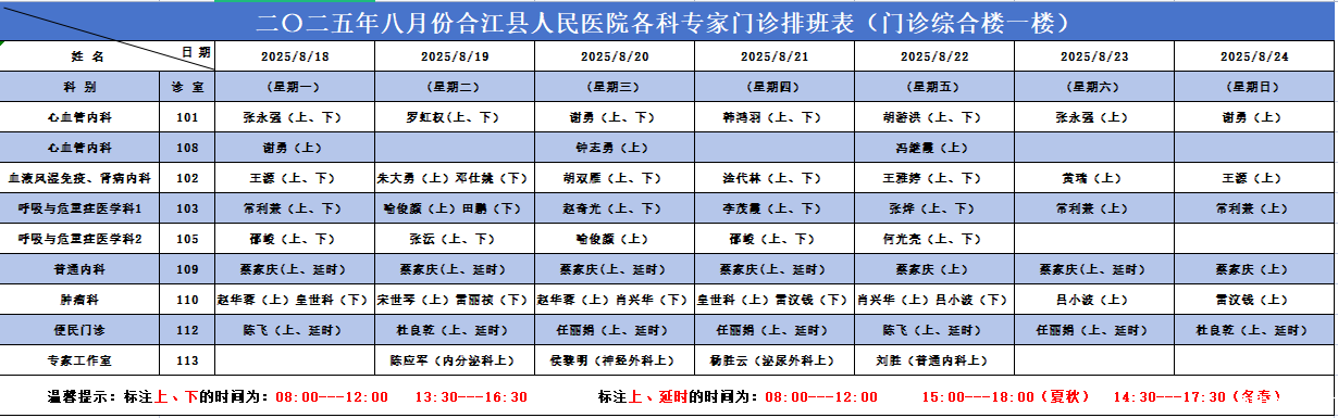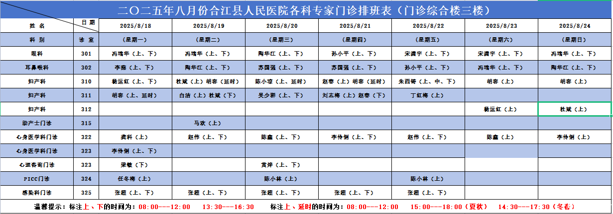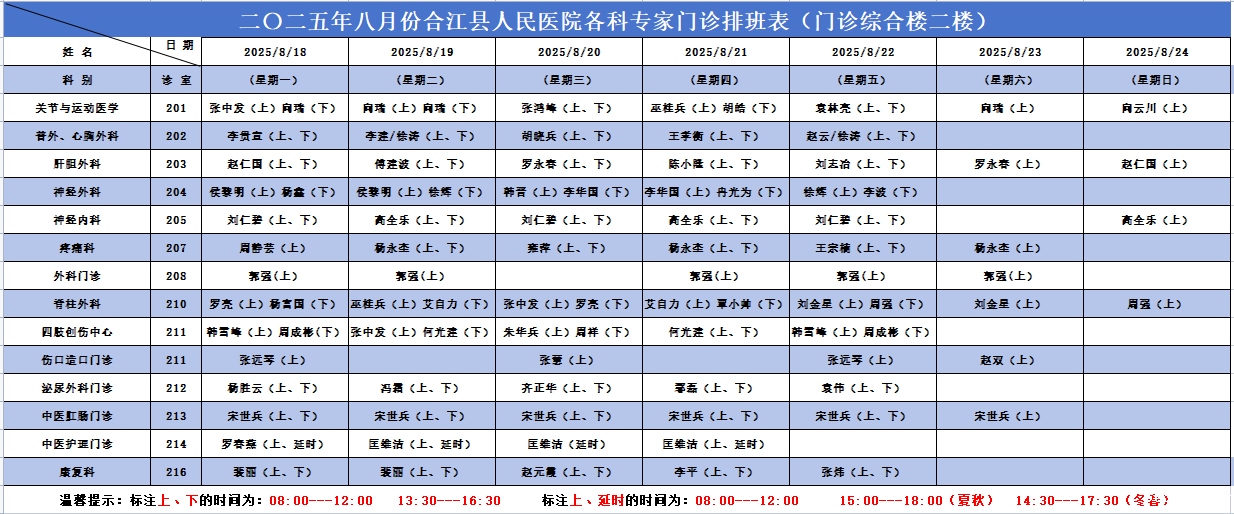 必威betway西汉姆联官方网站2025.08.18-2025.08.24各科专家门诊排班表