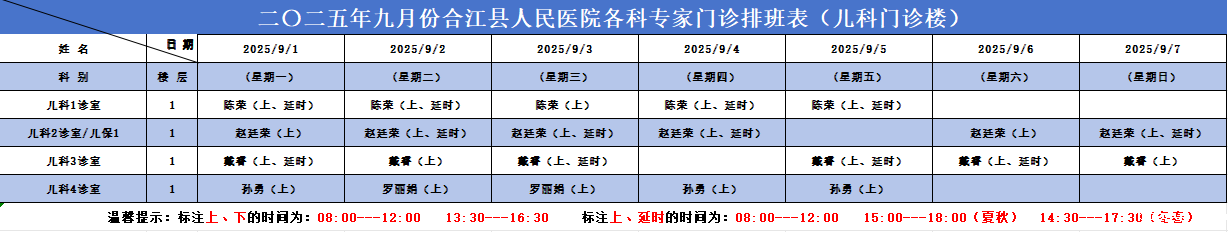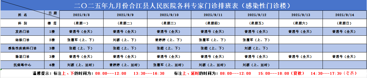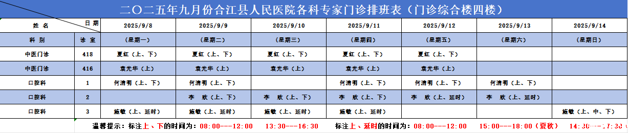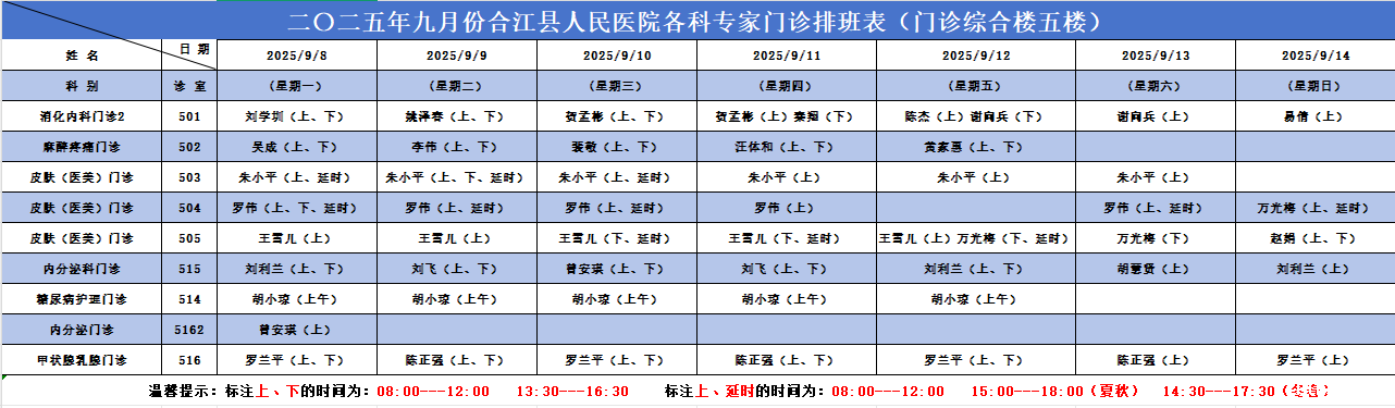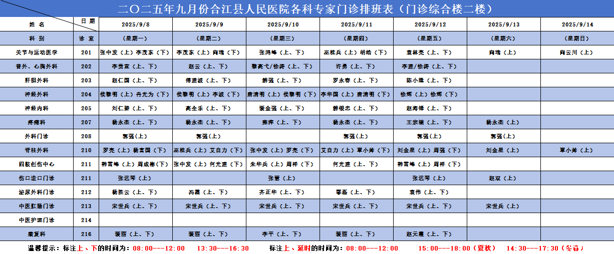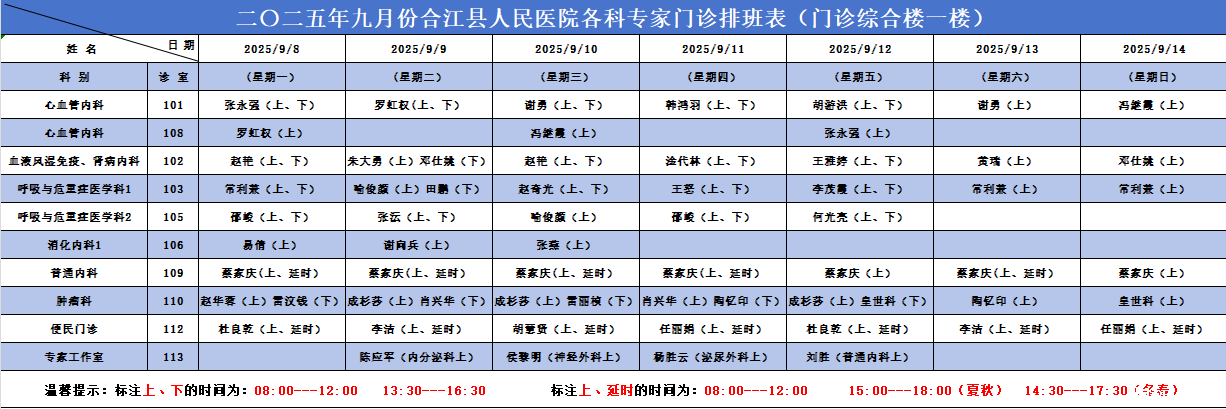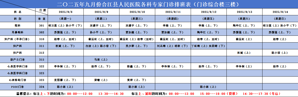 必威betway西汉姆联官方网站2025.09.08-2025.09.14各科专家门诊排班表