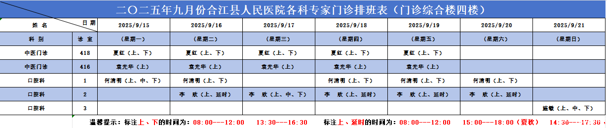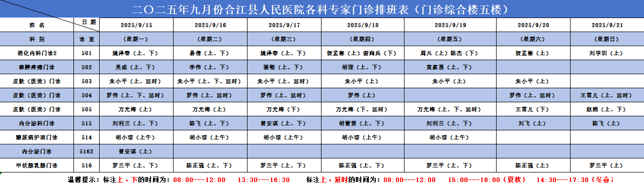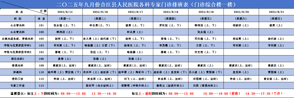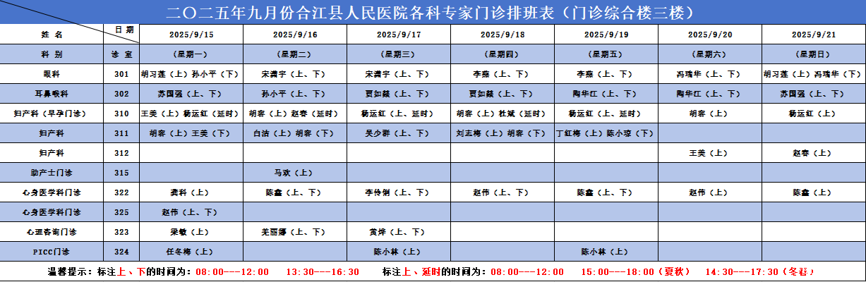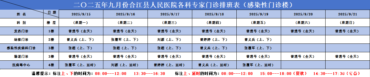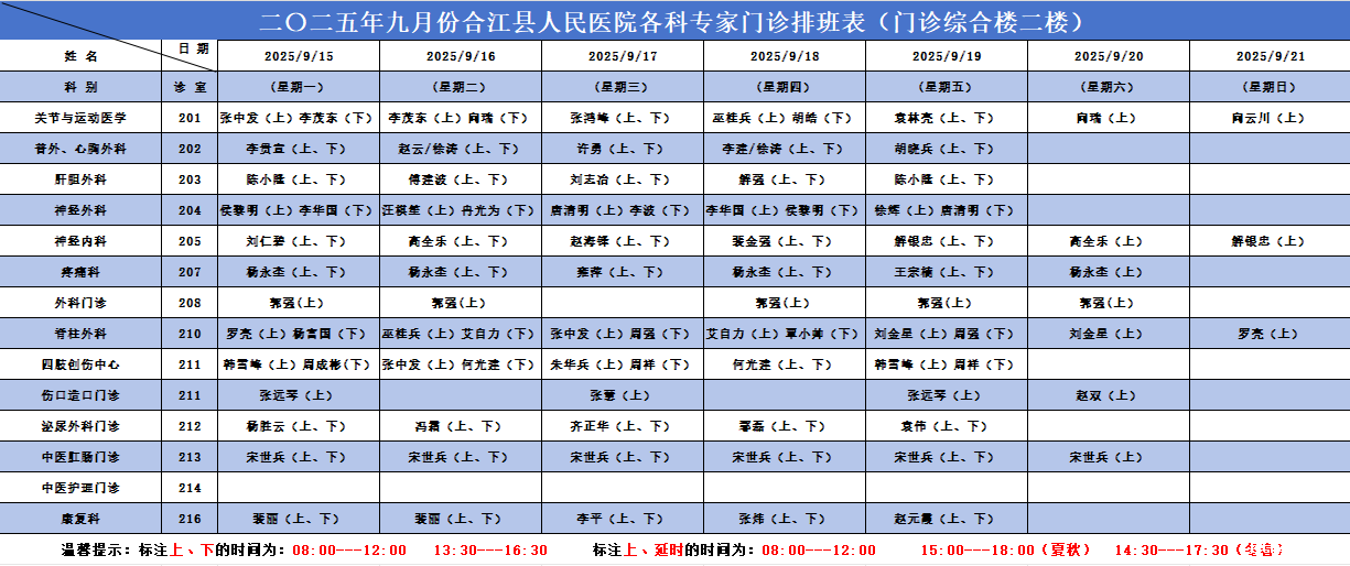 必威betway西汉姆联官方网站2025.09.15-2025.09.21各科专家门诊排班表