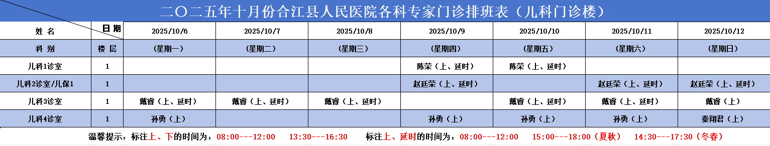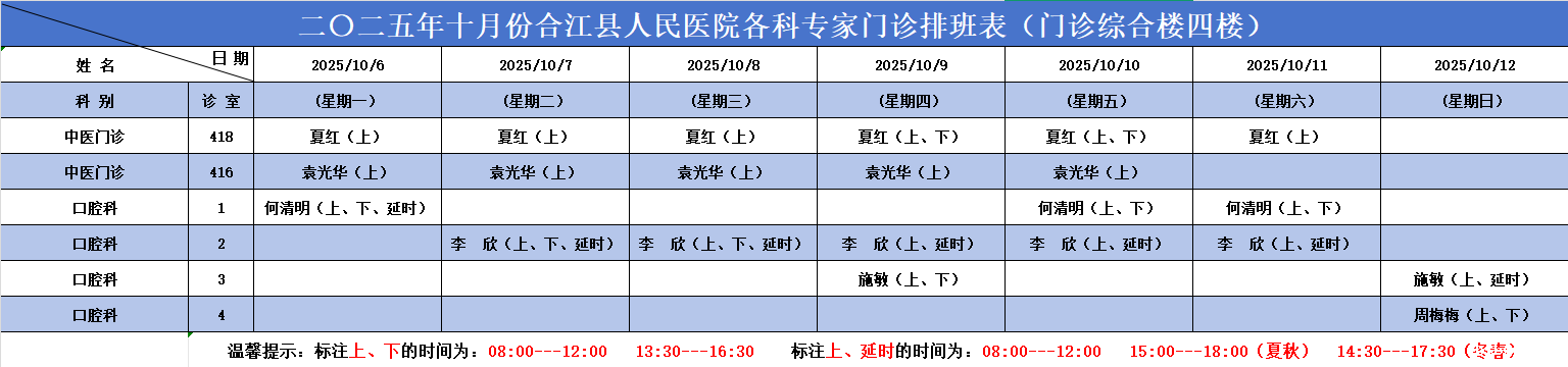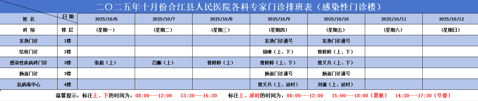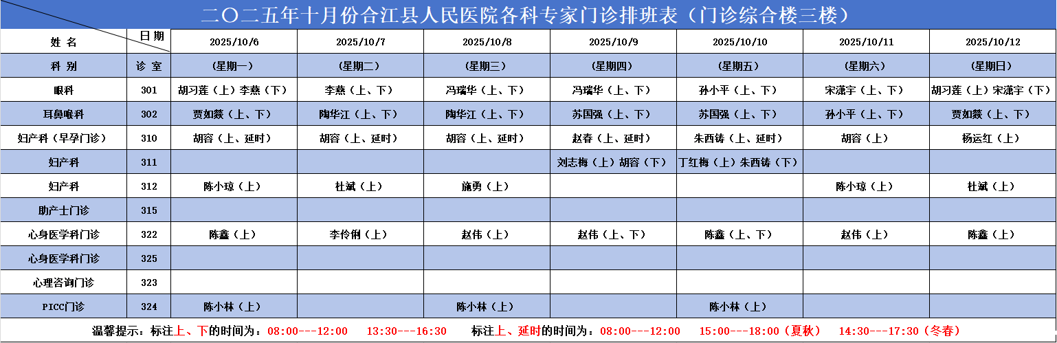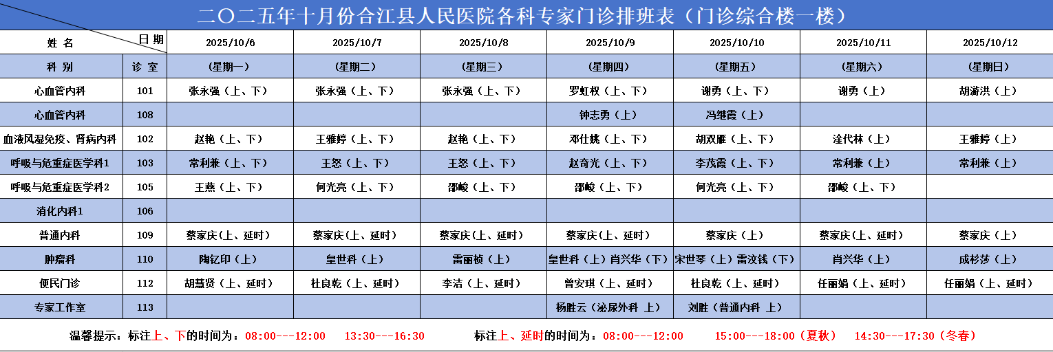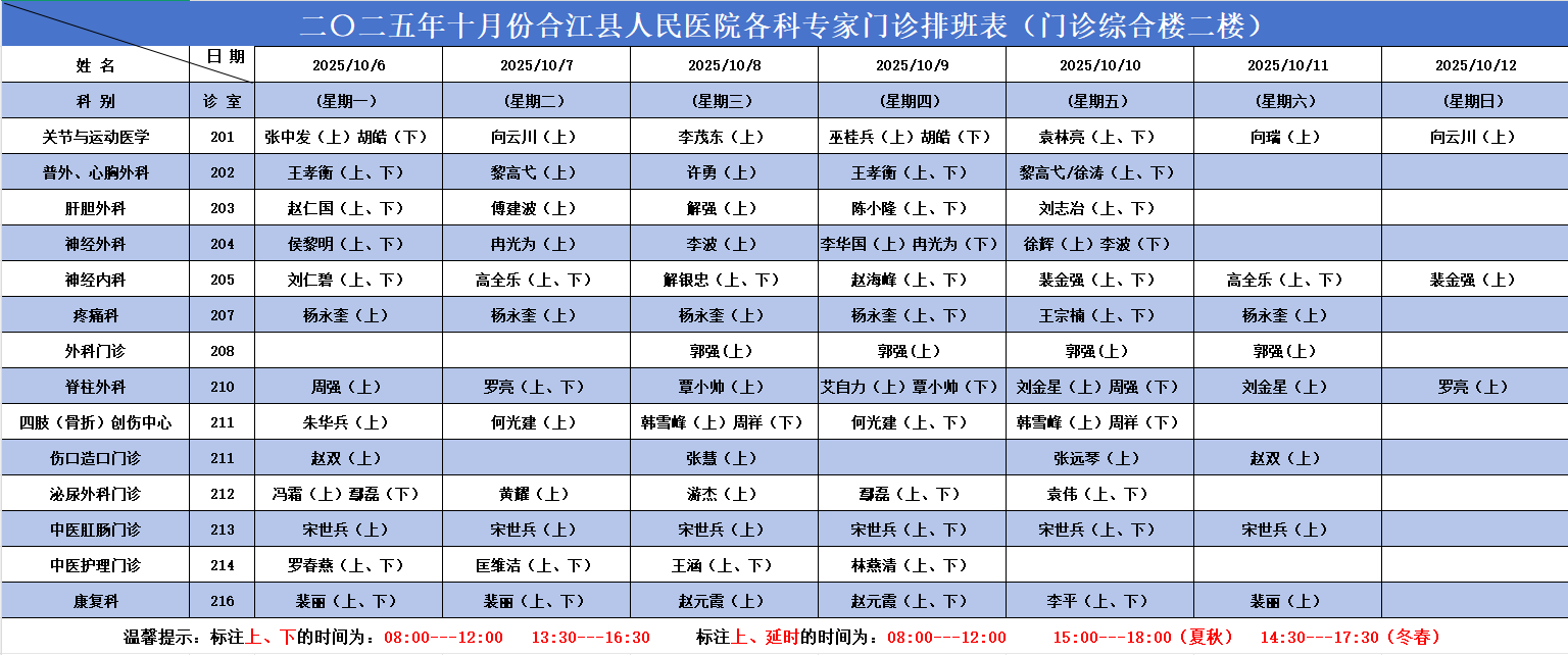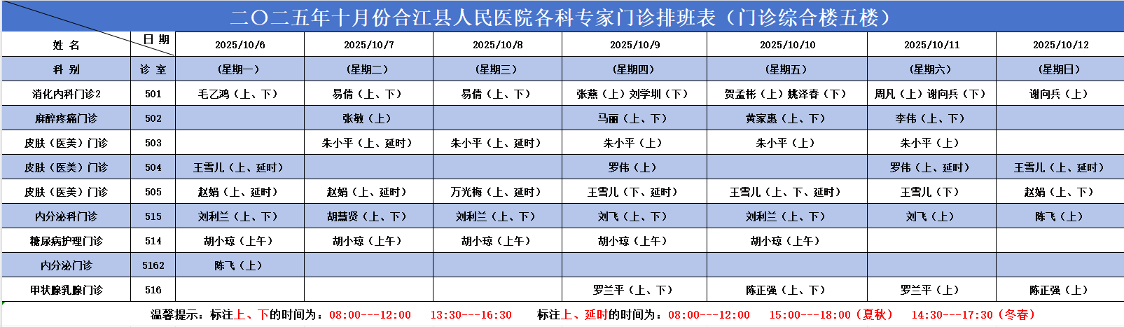 必威betway西汉姆联官方网站2025.10.06-2025.10.12各科专家门诊排班表