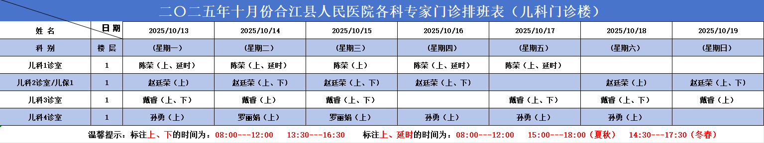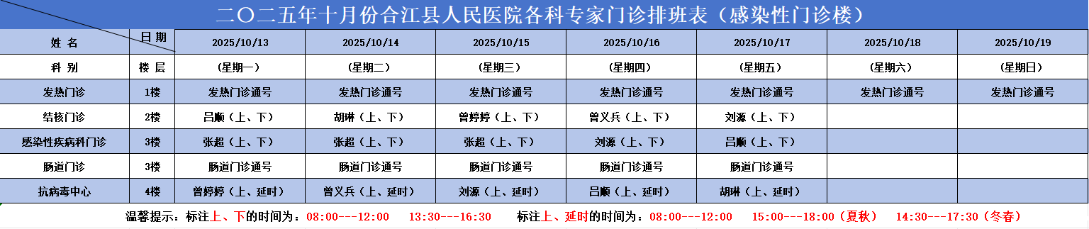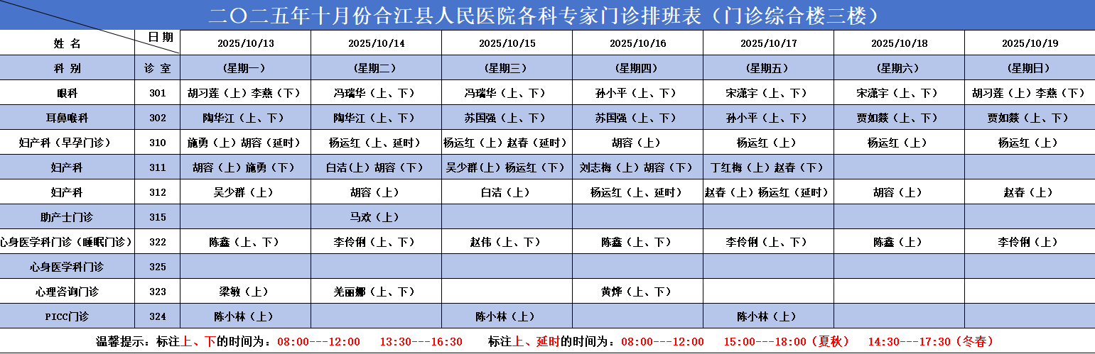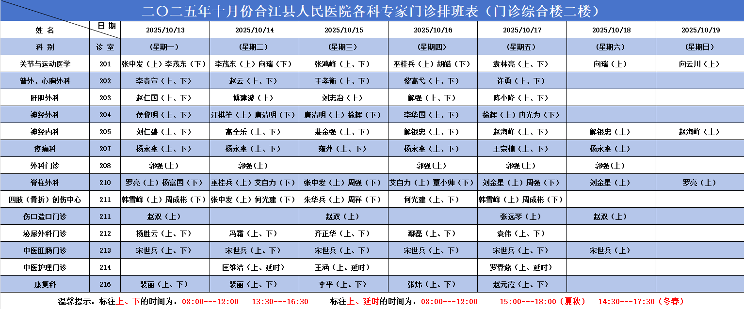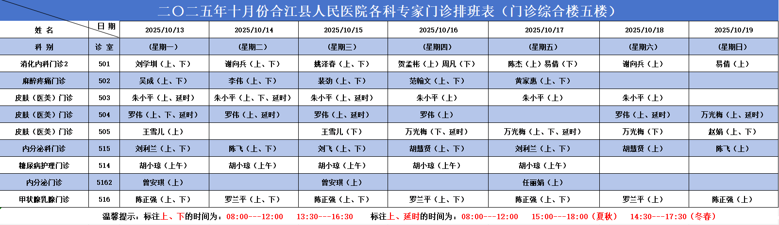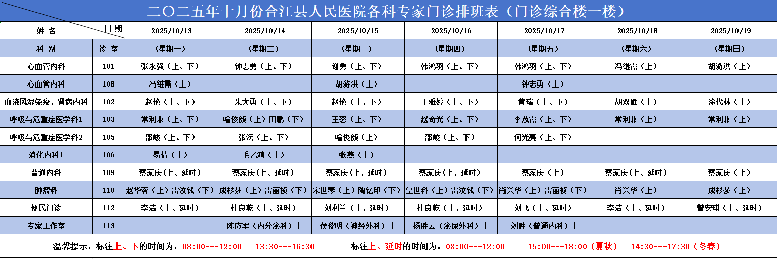 必威betway西汉姆联官方网站2025.10.13-2025.10.19各科专家门诊排班表