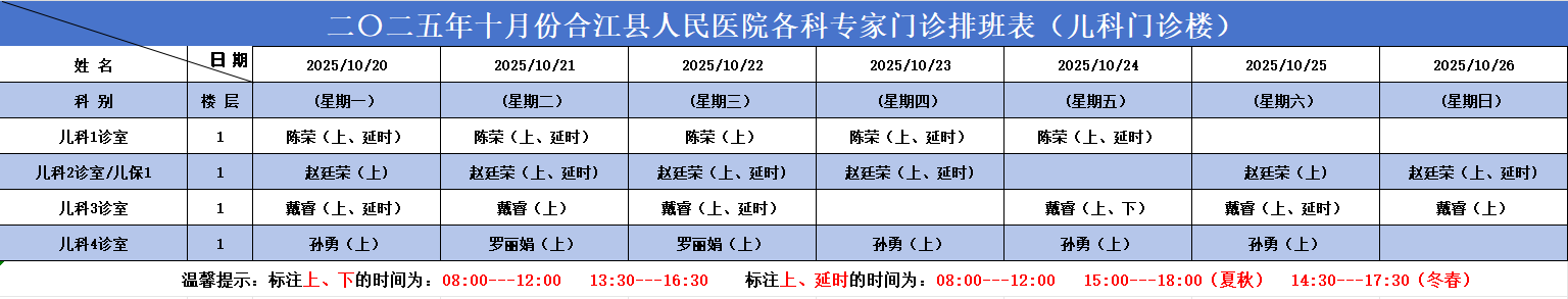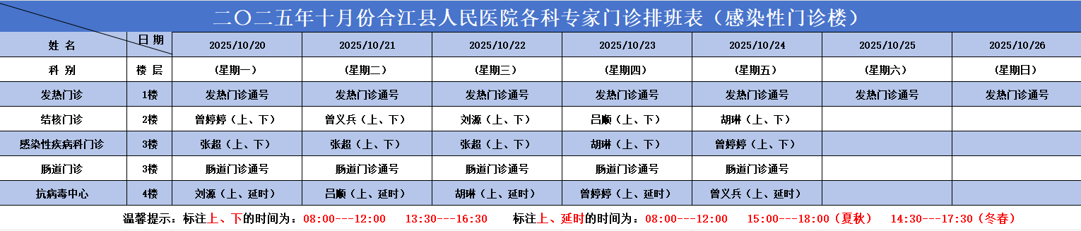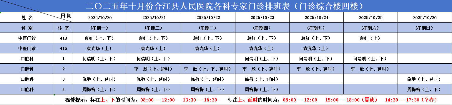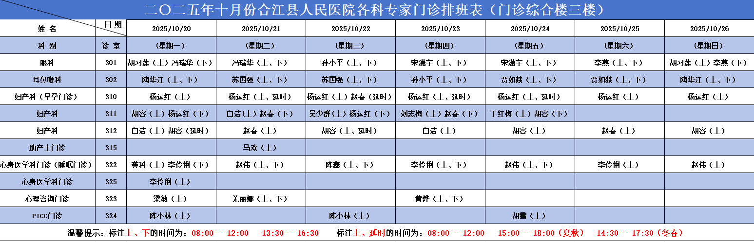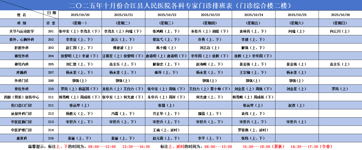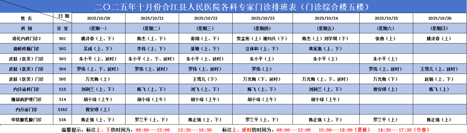必威betway西汉姆联官方网站2025.10.20-2025.10.26各科专家门诊排班表