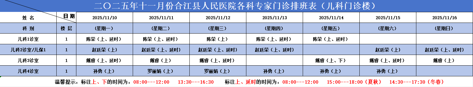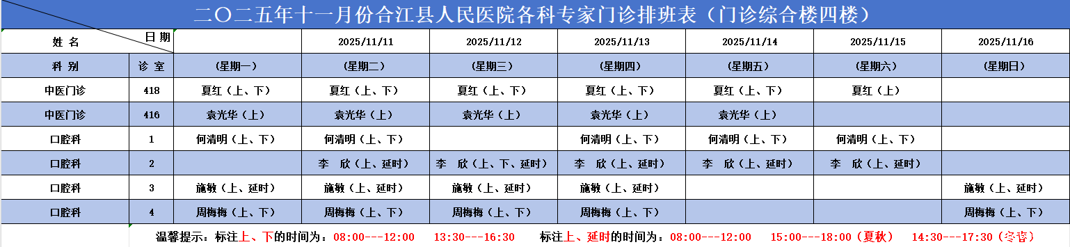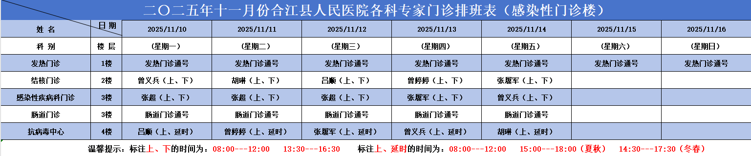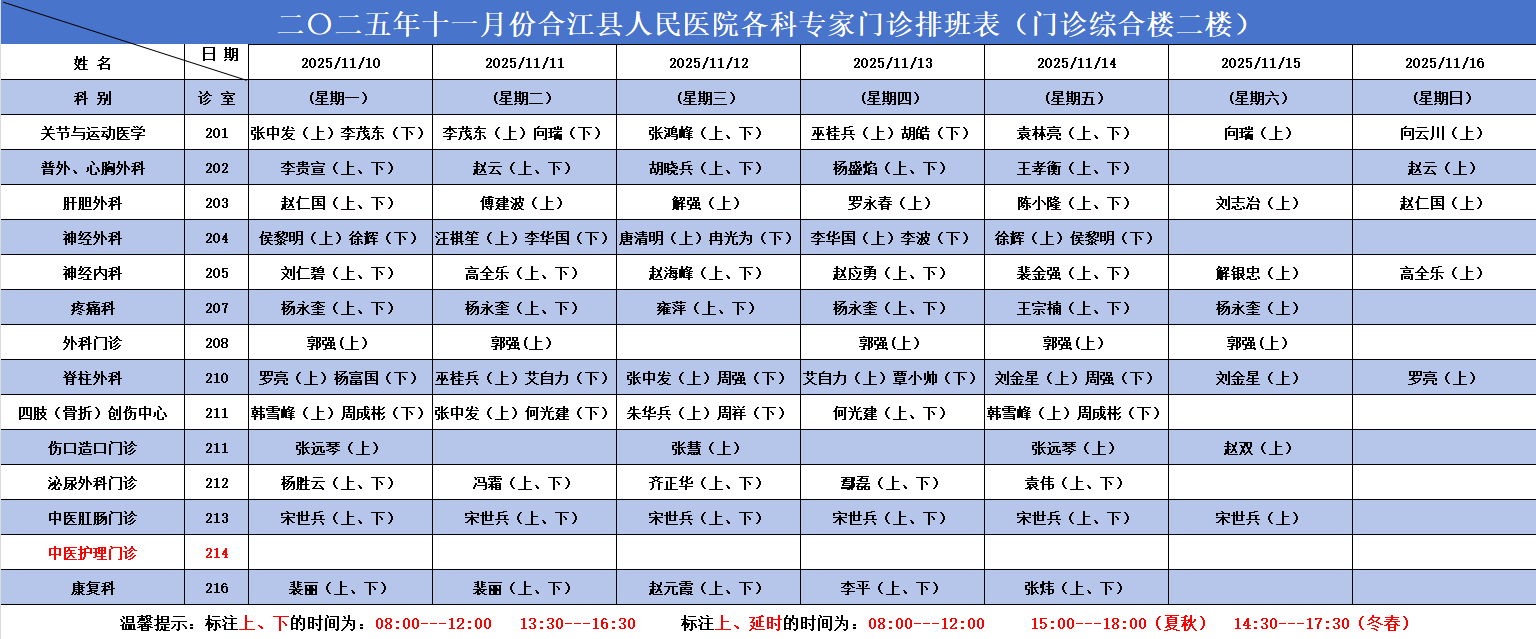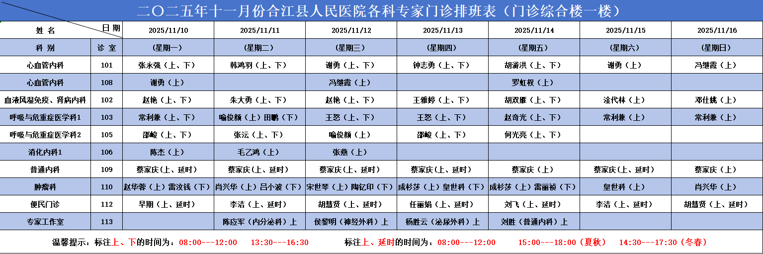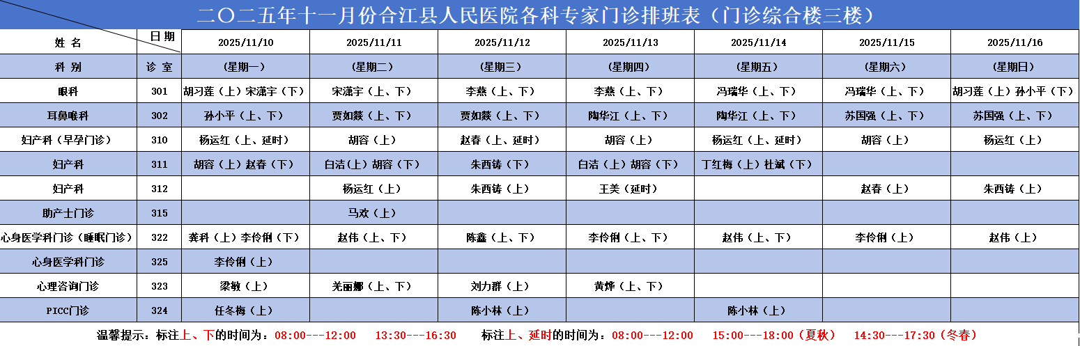 必威betway西汉姆联官方网站2025.11.10-2025.11.16各科专家门诊排班表